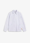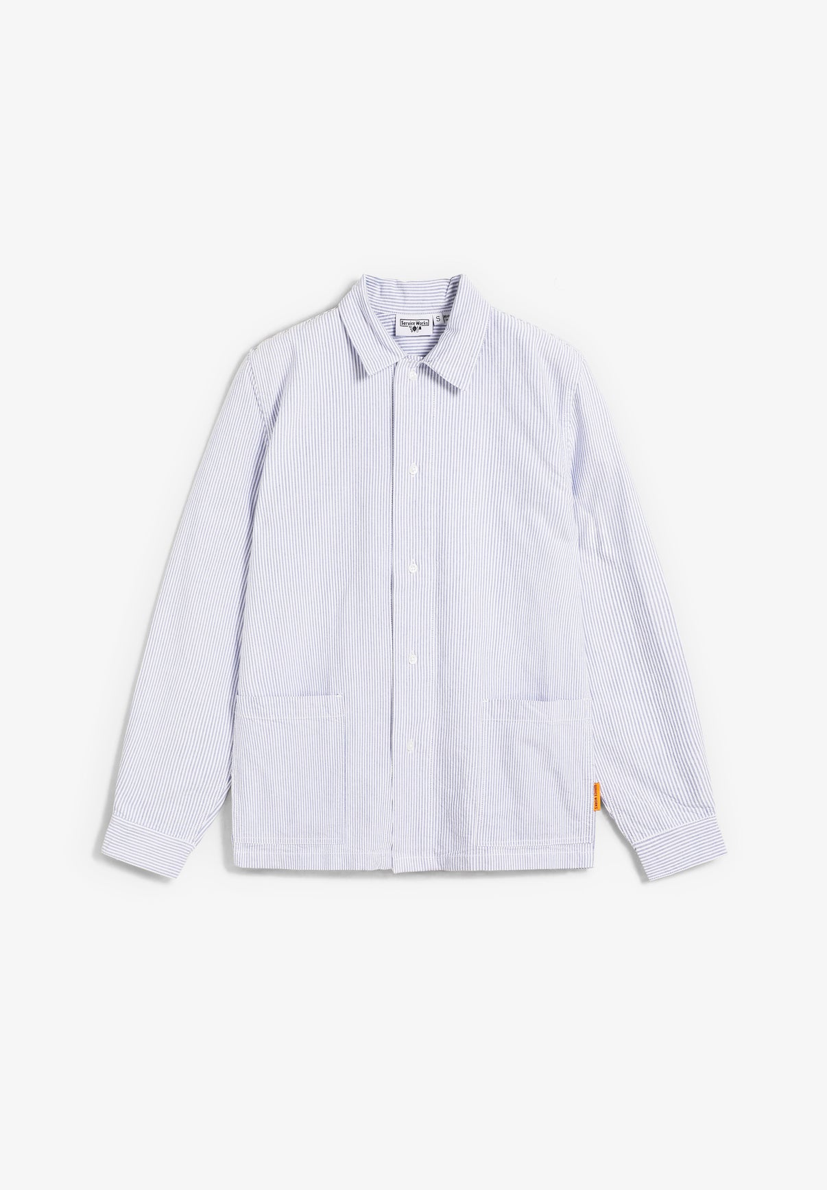 Camisa Service Works confeccionada en algodón orgánico GOTS de 165 GSM. Presenta una tapeta ancha, cuello plano, dobladillo plano, bolsillos con costuras montadas y cierre de botón.
