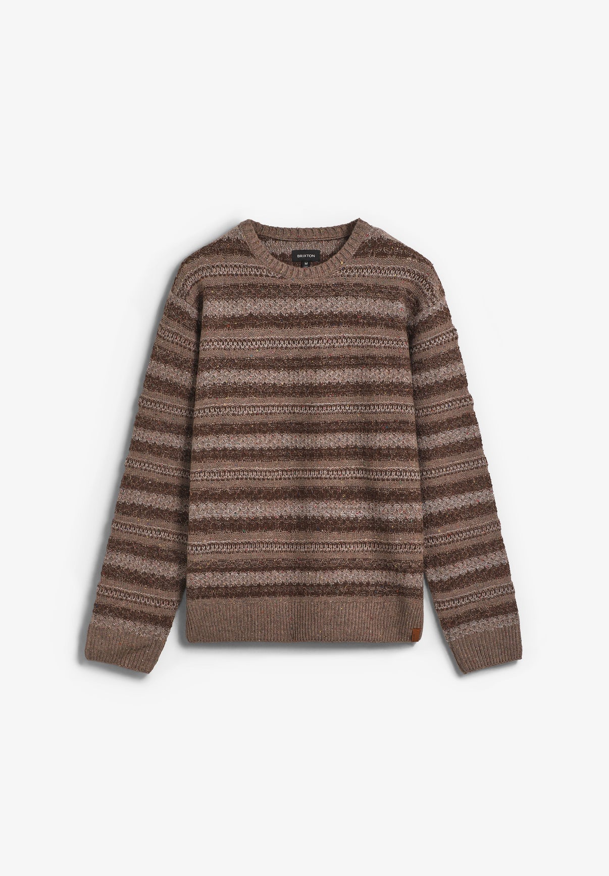 Sudadera Brixton confeccionado en 46% poliéster, 23% acrílico, 19% lana, 10% nailon y 2% otras fibras. Presenta cuello redondo inspirado en los años 50, luce llamativas rayas teñidas en hilo y mangas con puños y cintura acanalados.