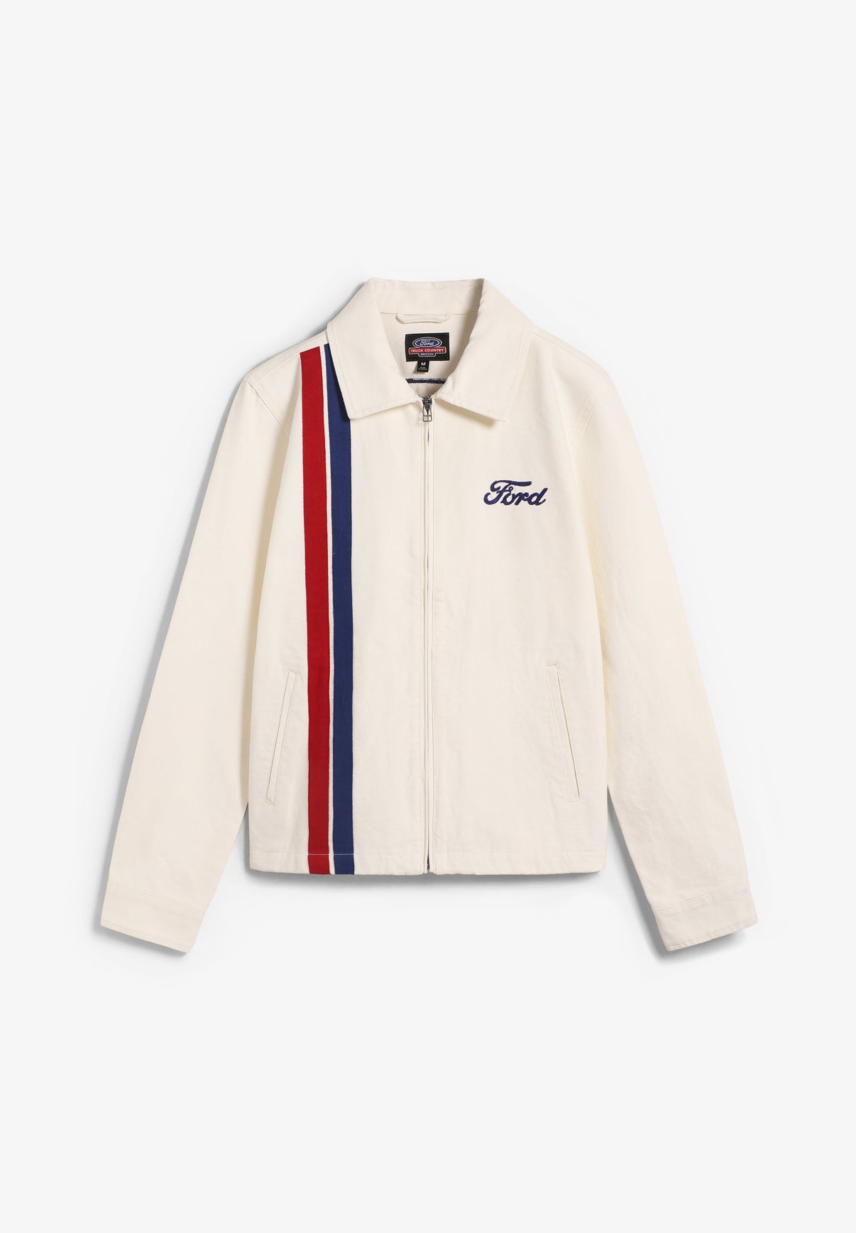 Chaqueta Brixton confeccionada en 100% algodón, guiño a la cultura de los coches clásicos y al estilo retro de las carreras. Luce llamativas rayas de carreras en rojo y blanco, junto con logotipos bordados en cadeneta en el pecho y la espalda. Presenta un cierre frontal de cremallera, bolsillos delanteros de ribete y detalle etiqueta de costura lateral.