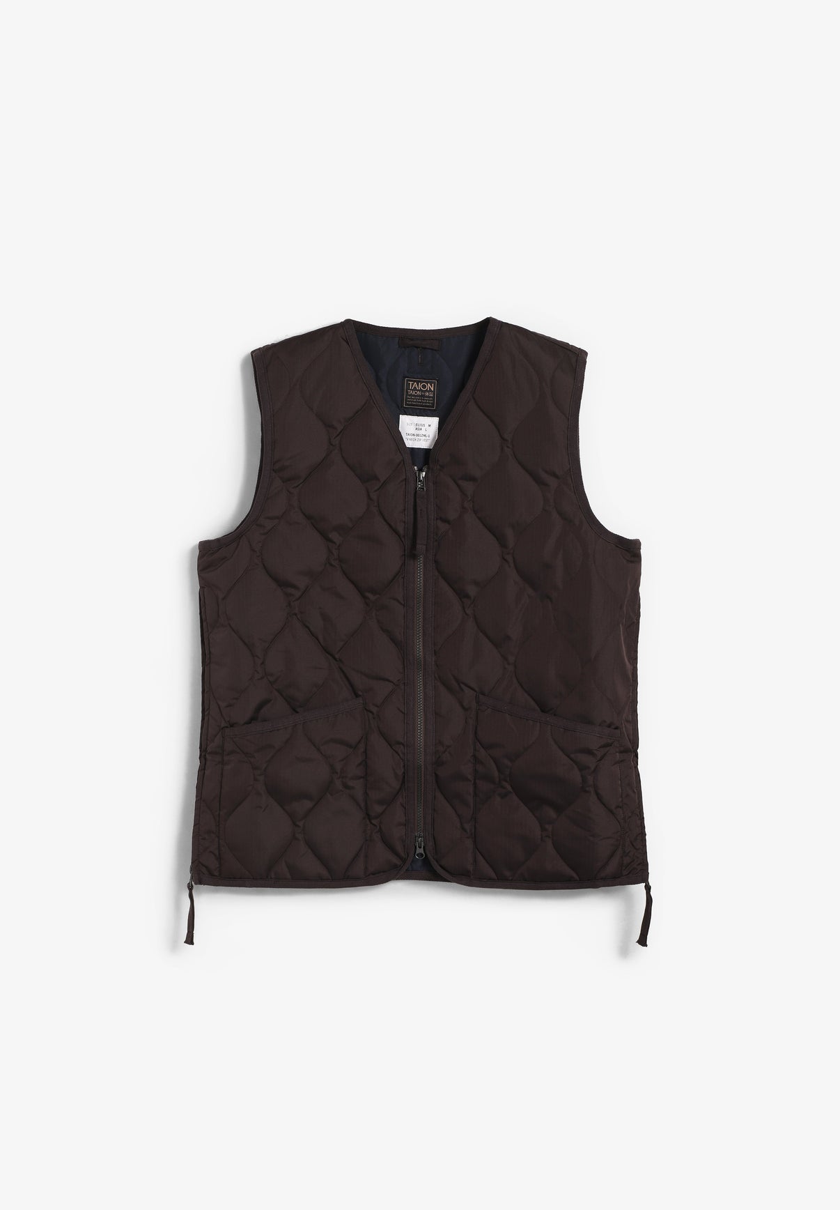 Chaleco Taion confeccionado en un tejido ligero y suave y relleno de plumón 800FP. Presenta una clásica puntada acolchada de cebolla que realza su estilo militar, cremallera bidireccional y aberturas laterales que aumentan la libertad de movimiento y facilitan el acceso a los bolsillos del pantalón.