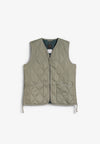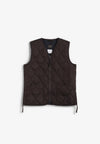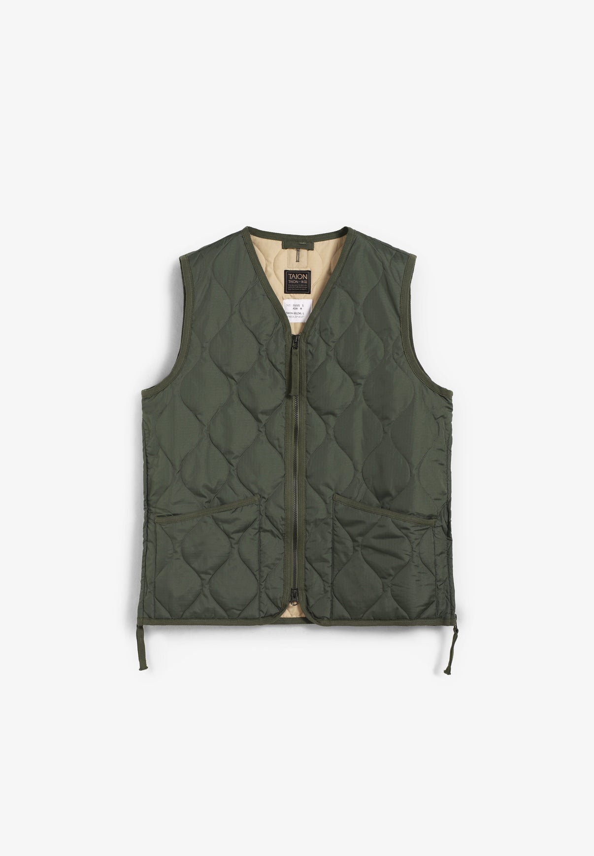 Chaleco Taion confeccionado en un tejido ligero y suave y relleno de plumón 800FP. Presenta una clásica puntada acolchada de cebolla que realza su estilo militar, cremallera bidireccional y aberturas laterales que aumentan la libertad de movimiento y facilitan el acceso a los bolsillos del pantalón.
