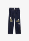 Pantalón vaquero We Are Not Friends confeccionado en 100% algodón índigo oscuro y decorado con parches extragrandes en contraste en tonos caqui y arena. Presentan un corte ancho y relajado de pierna y cintura media, construcción clásica de cinco bolsillos y bordado en el dobladillo con parche de cuero con la marca.
