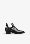 Botas Micuir confeccionadas en piel vacuna negra. Silueta abierta en el tobillo rematada con ribete a tono. Detalles de tachas metálicas hipoalérgicas en tono plata, un tacón de 4 cm de altura con plantilla de microgel para un mayor confort. Forro y plantilla de piel mestizo de cabra a tono y planta con certificado ''handmade in Spain'' con logo grabado a fuego. Incluye una bolsa de algodón.