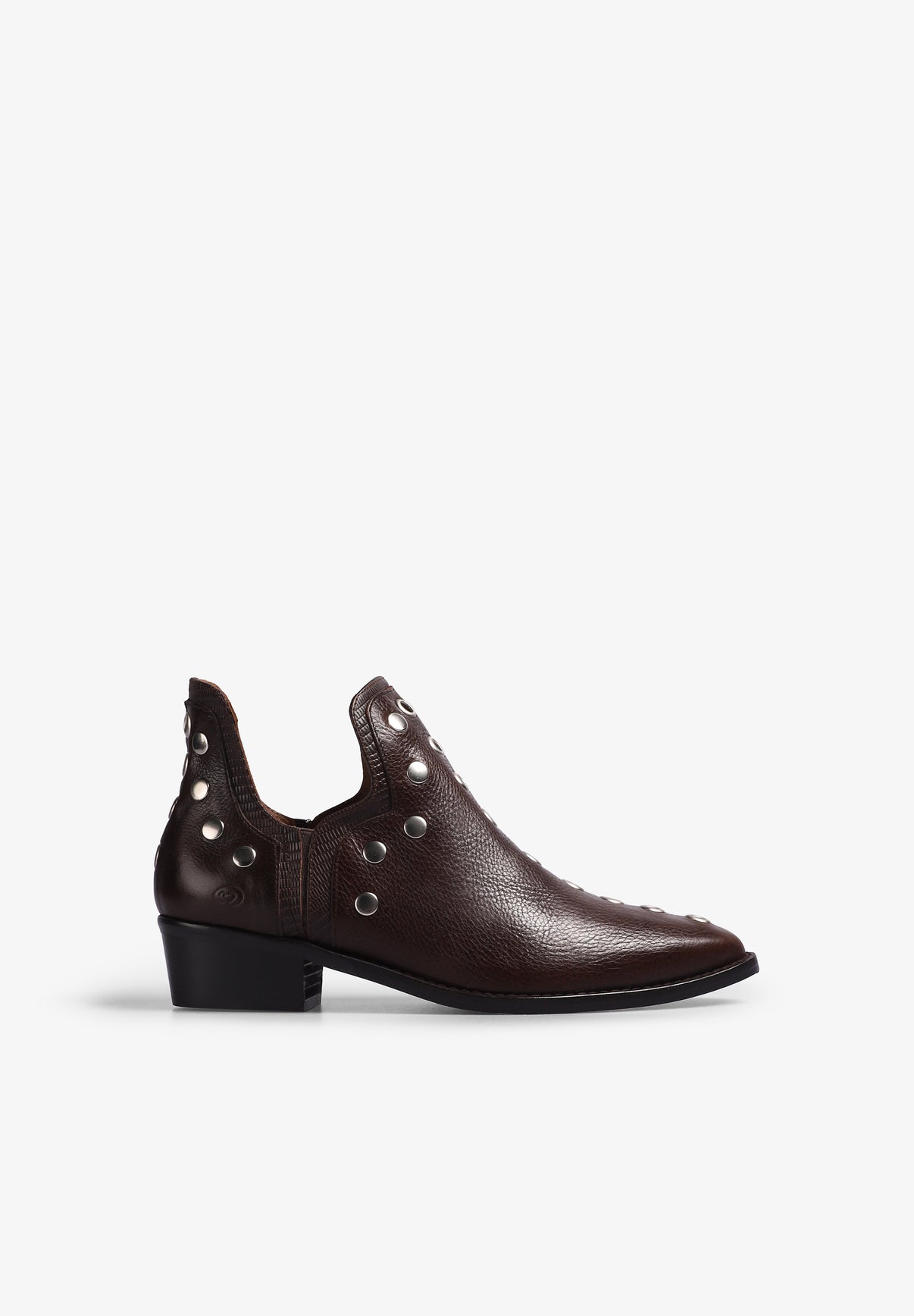 Botas Micuir confeccionadas en piel vacuno chocolate. Silueta abierta en el tobillo rematada con ribete de piel grabada a tono. Detalles de tachas metálicas hipoalérgicas en tono plata, un tacón de 4 cm de altura con plantilla de microgel para un mayor confort. Forro y plantilla de piel mestizo de cabra a tono y planta con certificado ''handmade in Spain'' con logo grabado a fuego. Incluye una bolsa de algodón.