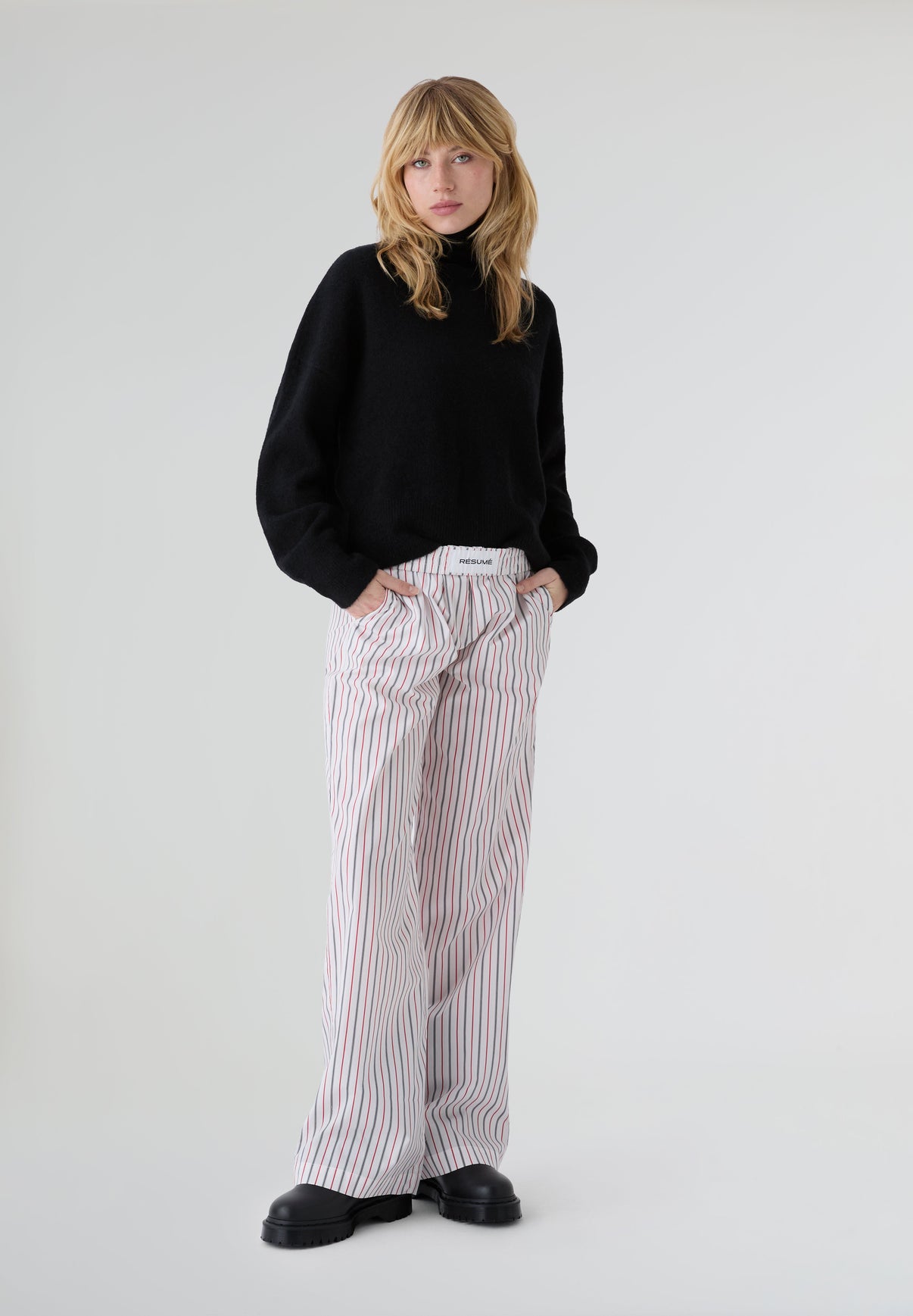 Pantalones Résumé confeccionados en 100% algodón. Presenta un corte entallado, diseño de rayas verticales y detalle etiqueta en la cintura.