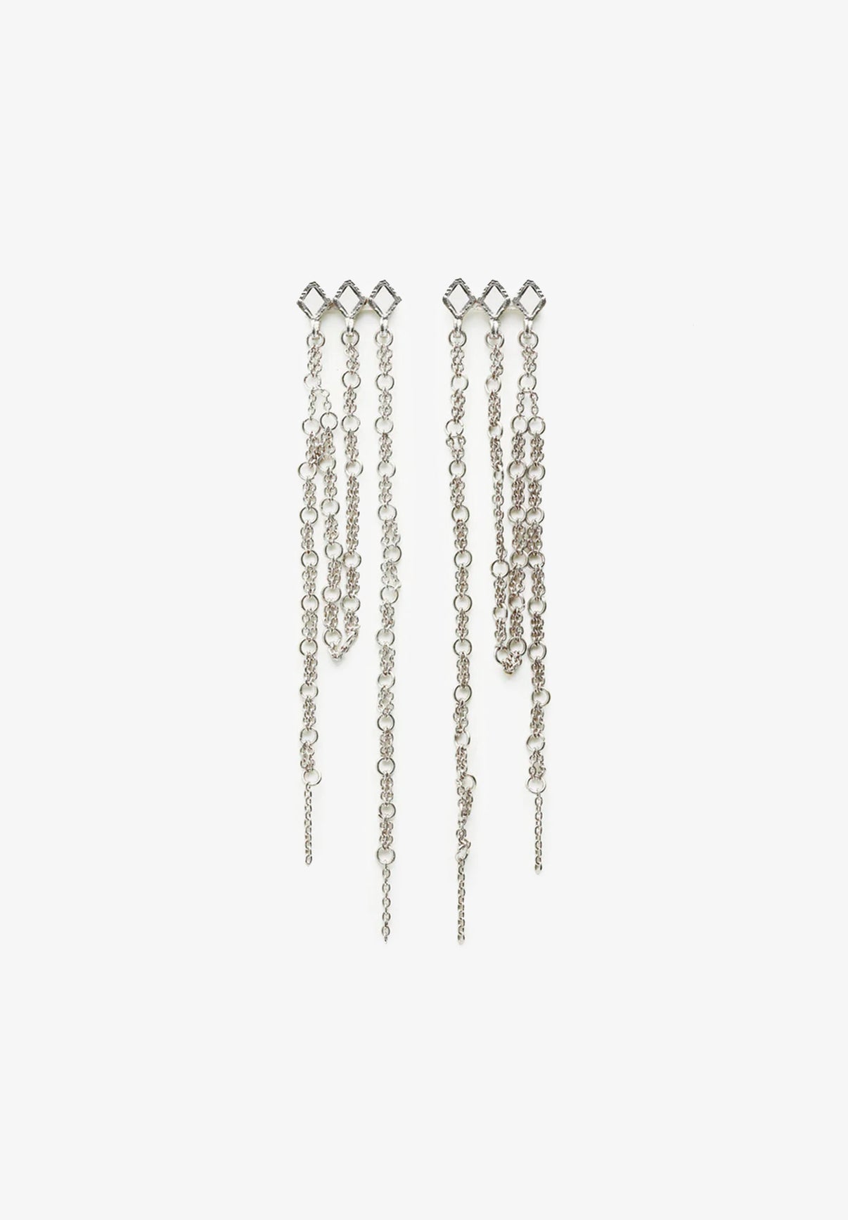 Pendientes Sach Atelier elaborado en latón con baño de plata y espejos, de tres rombos engarzados a mano y tres cadenas finas que cuelgan con movimiento. Son el complemento ideal para transformar cualquier look.