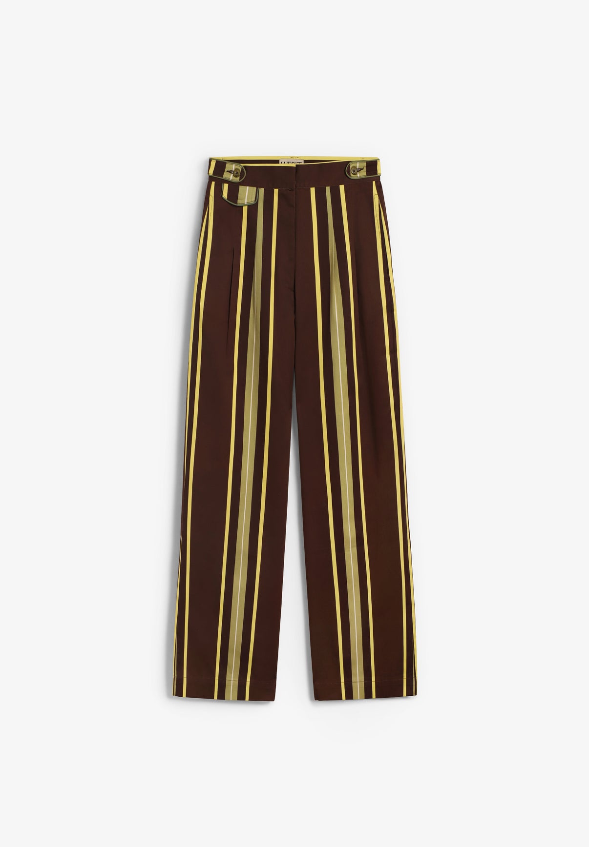 Pantalón Werit confeccionado en 97% algodón y 3% elastano. Presenta un diseño fluido de pinzas confeccionado en tejido de sarga de algodón de rayas tricolor, bolsillos laterales y detalle de vivos a contraste en tapetas y cinturilla con botón.