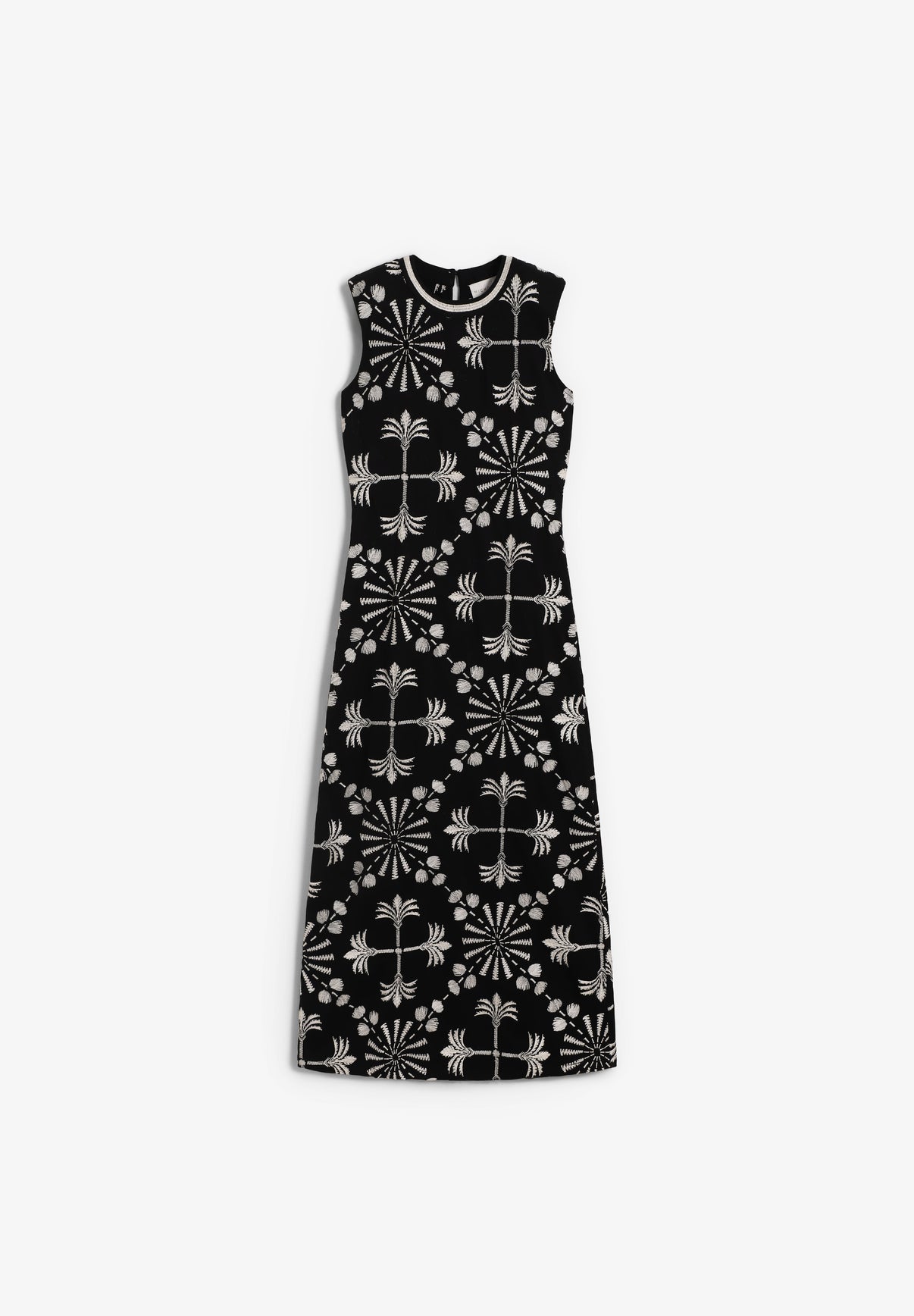 Vestido Michonet confeccionado en 100% algodón. Presenta un elegante corte recto, sin mangas y escote a la caja bordado a contraste. Su bordado geométrico en tono blanco roto, inspirado en formas orgánicas con estructura geométrica que evoca un paisaje tropical nocturno. Finas hombreras forradas y caída fluida.