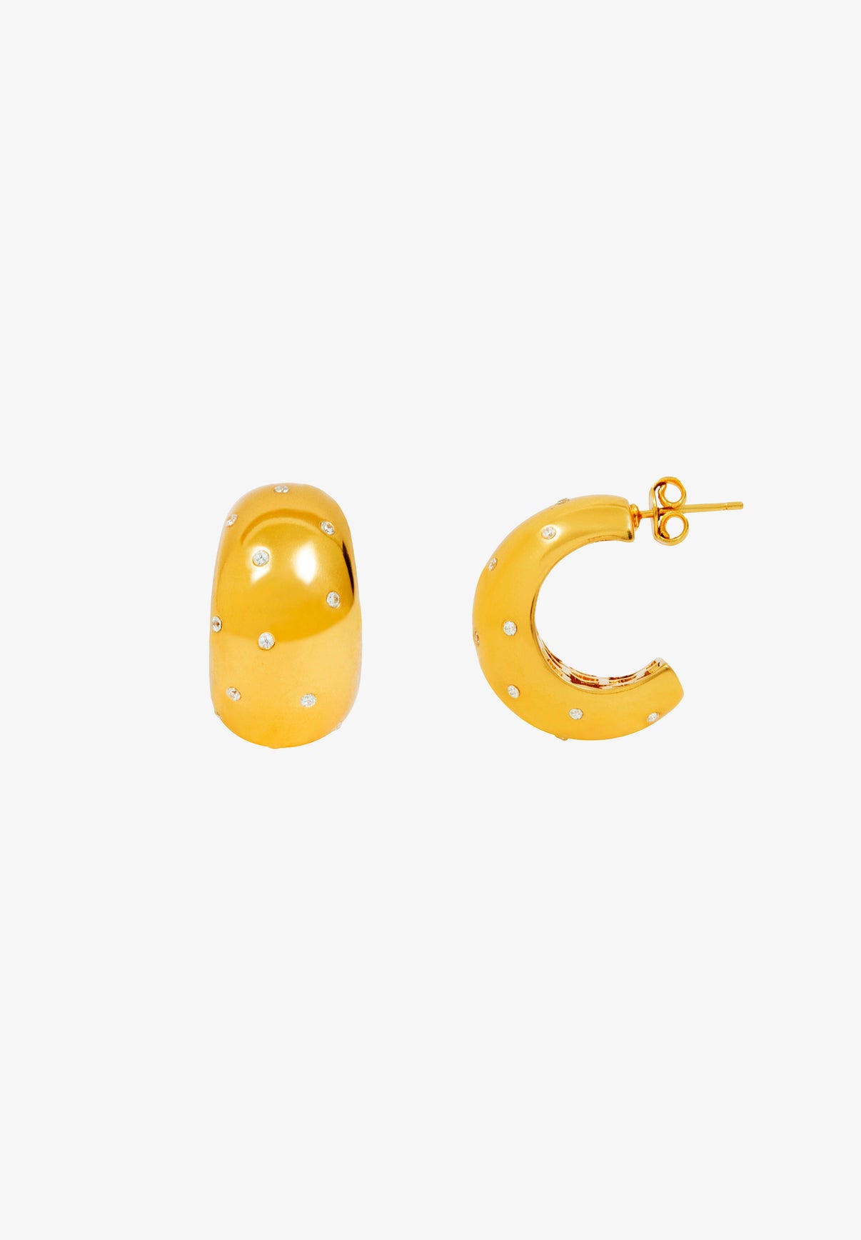Pendientes Moncollier tipo aro, anchos, en forma de media luna con circonitas y con cierre a presión de mariposa.