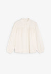 Camisa Bash confeccionada en 51% algodón y 49% viscosa. Presenta un cuello de volantes, detalles fruncidos, caída fluida y detalle de bordado en toda la prenda. Corte recto e inserción de encaje fino.