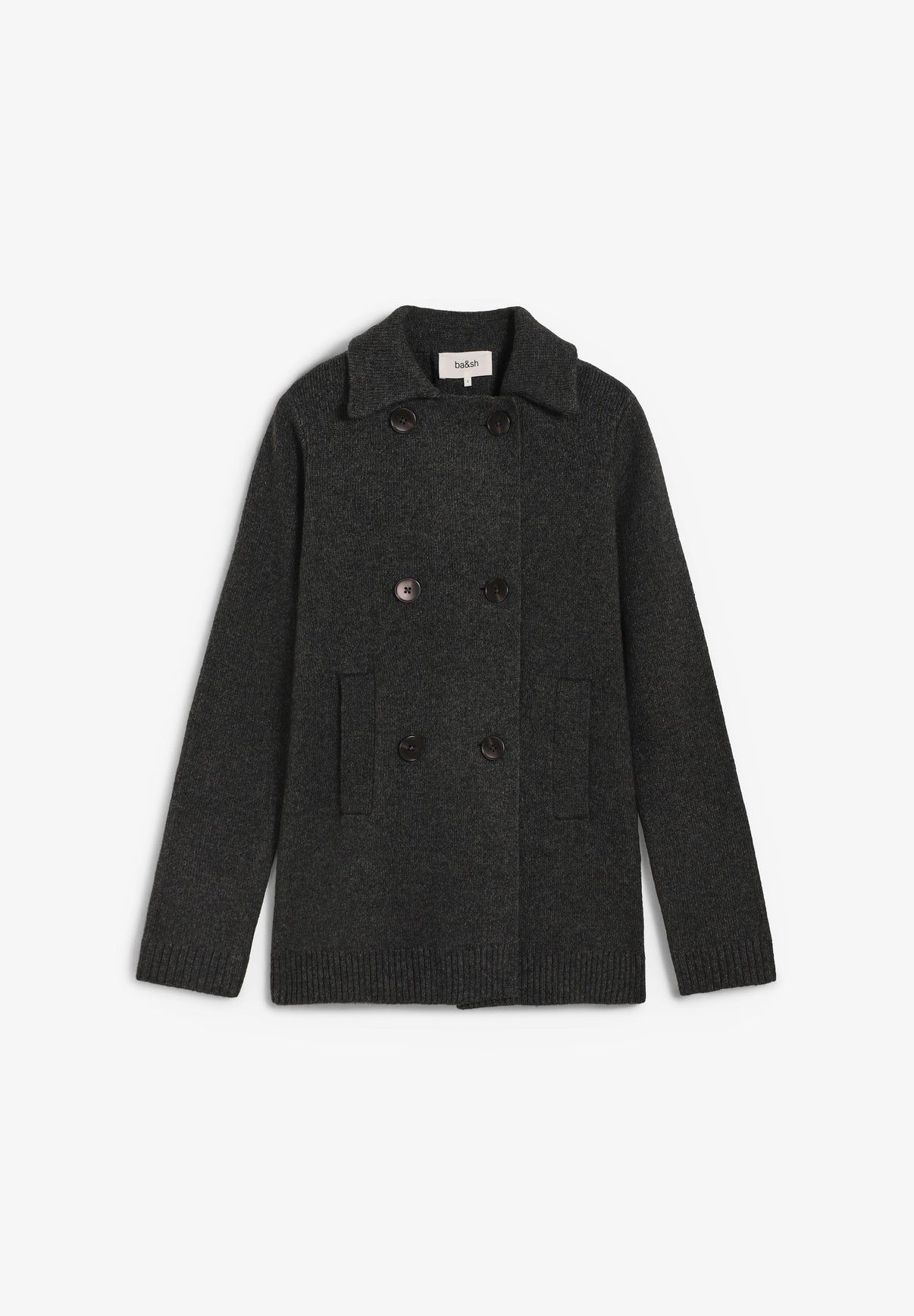 Abrigo estilo cárdigan Bash confeccionado en 80% lana y 20% poliamida. Presenta un diseño mezcla entra abrigo y cárdigan lo que lo convierte en una prenda única. Cuenta con cuello en pico, cierre frontal de botones, puños y bajo acanalados y pliegue en la parte central de la espalda.