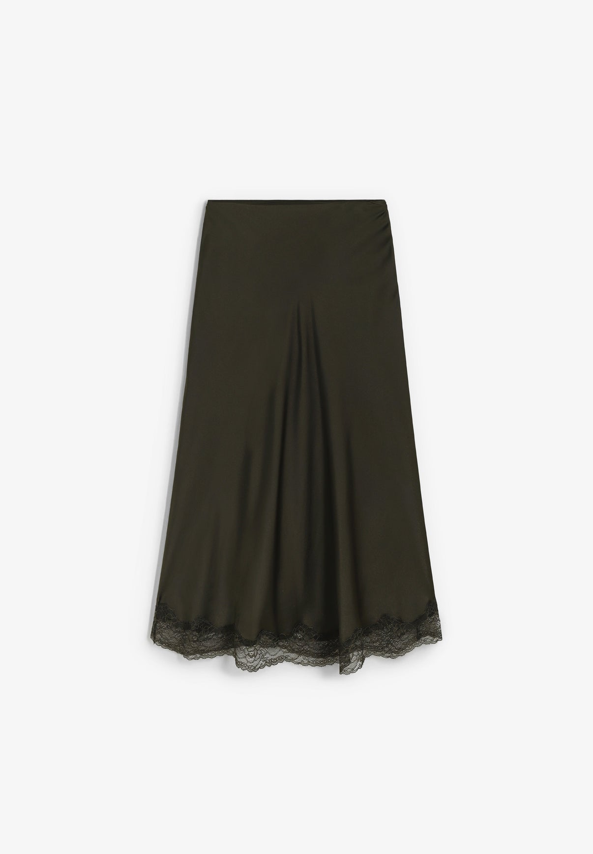 Falda Bash confeccionada en 100% poliéster. Presenta un largo midi, cierre de cremallera invisible en el lateral, corte al bies para un ajuste perfecto y detalle de ribete de encaje en la parte inferior