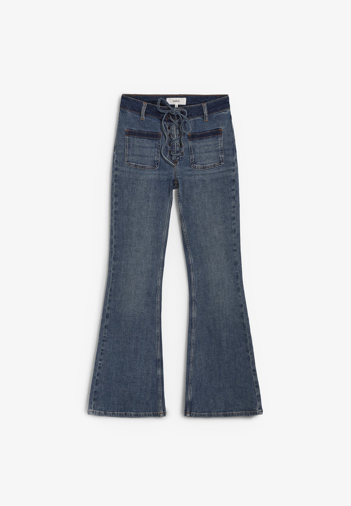 Pantalón vaquero Bash confeccionado en 98% algodón y 2% elastano. Presenta un corte ajustado por arriba y acampanado en la parte inferior. Detalle de cierre con cordones en la zona de la bragueta y bolsillos de parche.