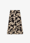 Falda Mim Shoes de tiro medio fluida con corte evasé confeccionada en 100% poliéster. Presenta cremallera lateral, forro interior combinado y print de motivos florales en tonos off white y negro.