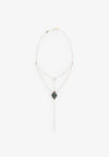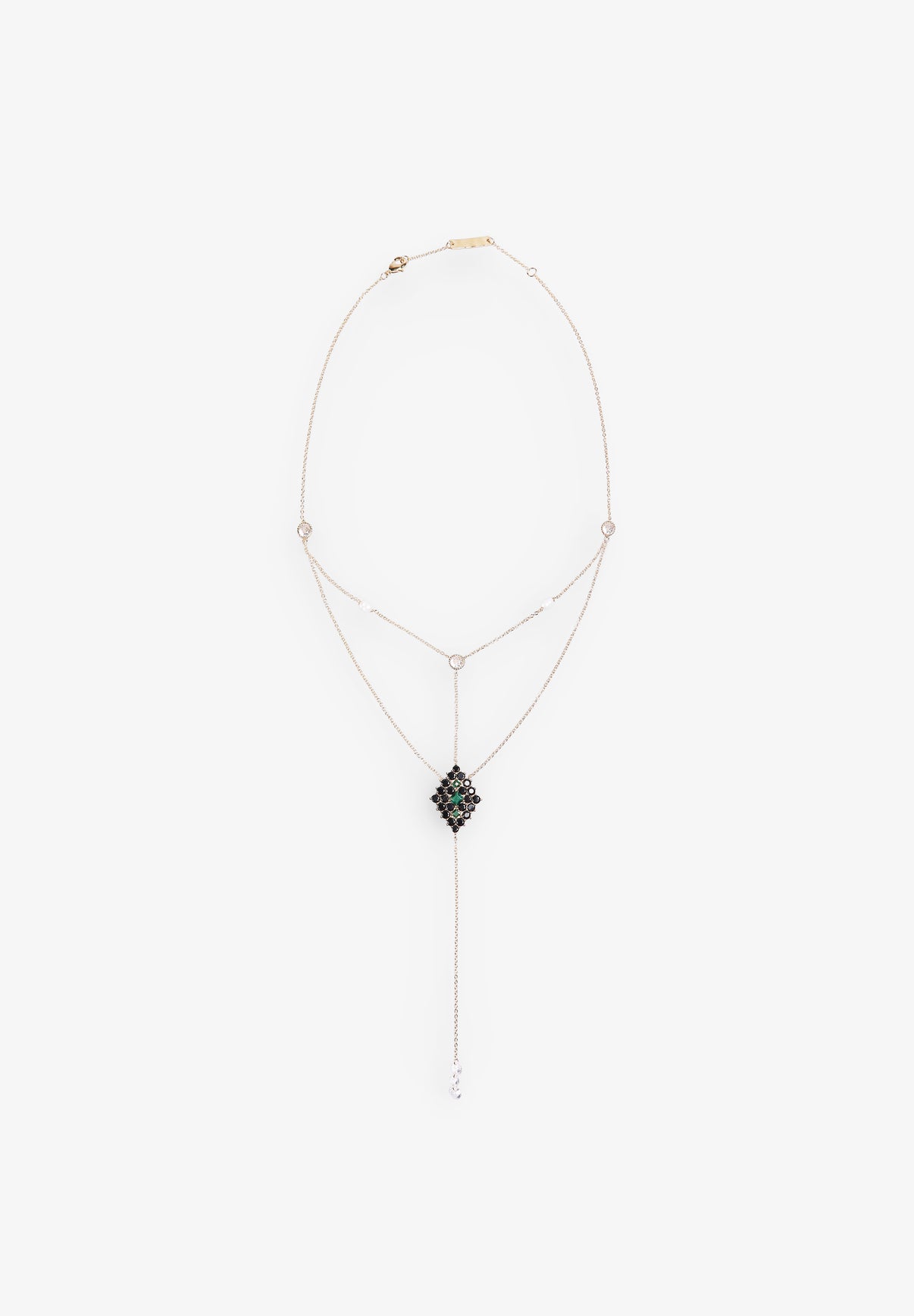 Collar Specciale confeccionado en latón bañado en oro de 18 quilates. Presenta una fina cadena doble adornada con detalles de circonitas de color verde esmeralda en distintos tamaños y perlas naturales.