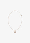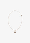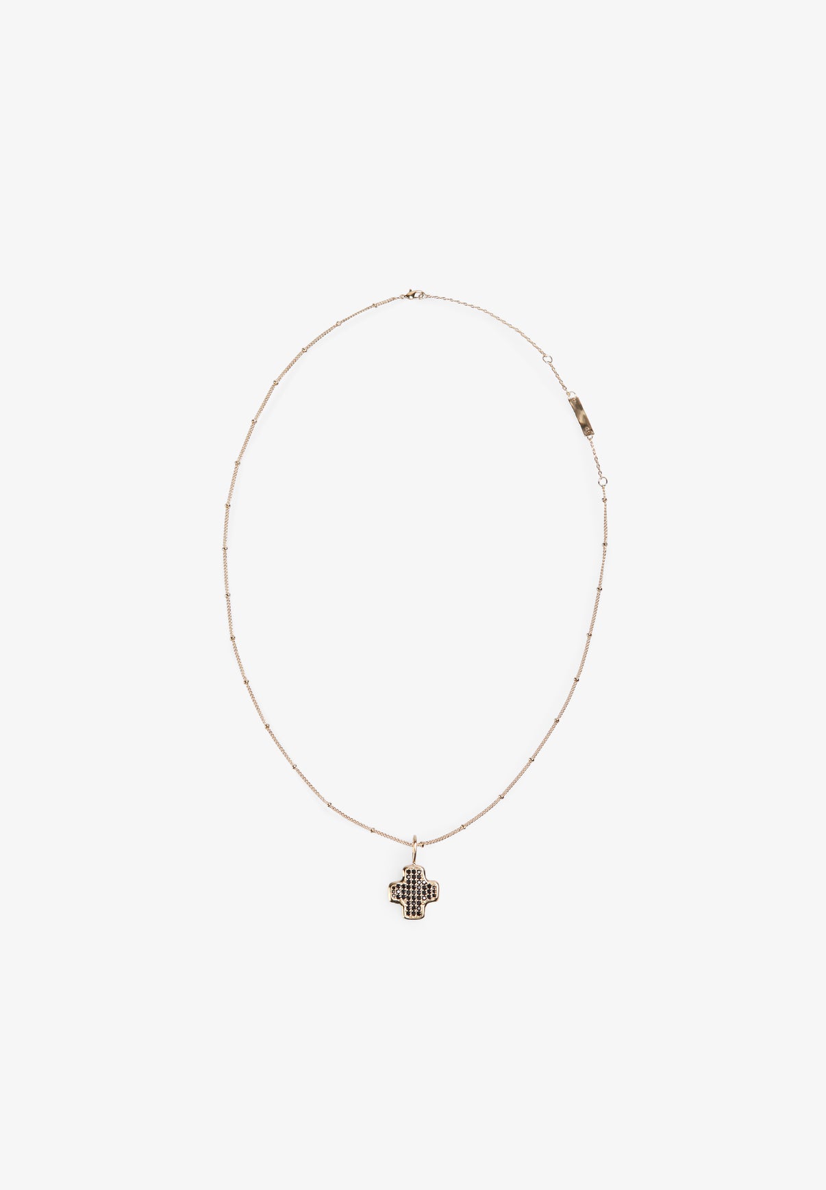 Collar Specciale confeccionado en latón bañado en oro de 18 quilates. Presenta circonitas negras engastadas y una cadena de 45cm con una extensión de 5cm sutilmente adornado con pequeñas bolitas intercaladas.
