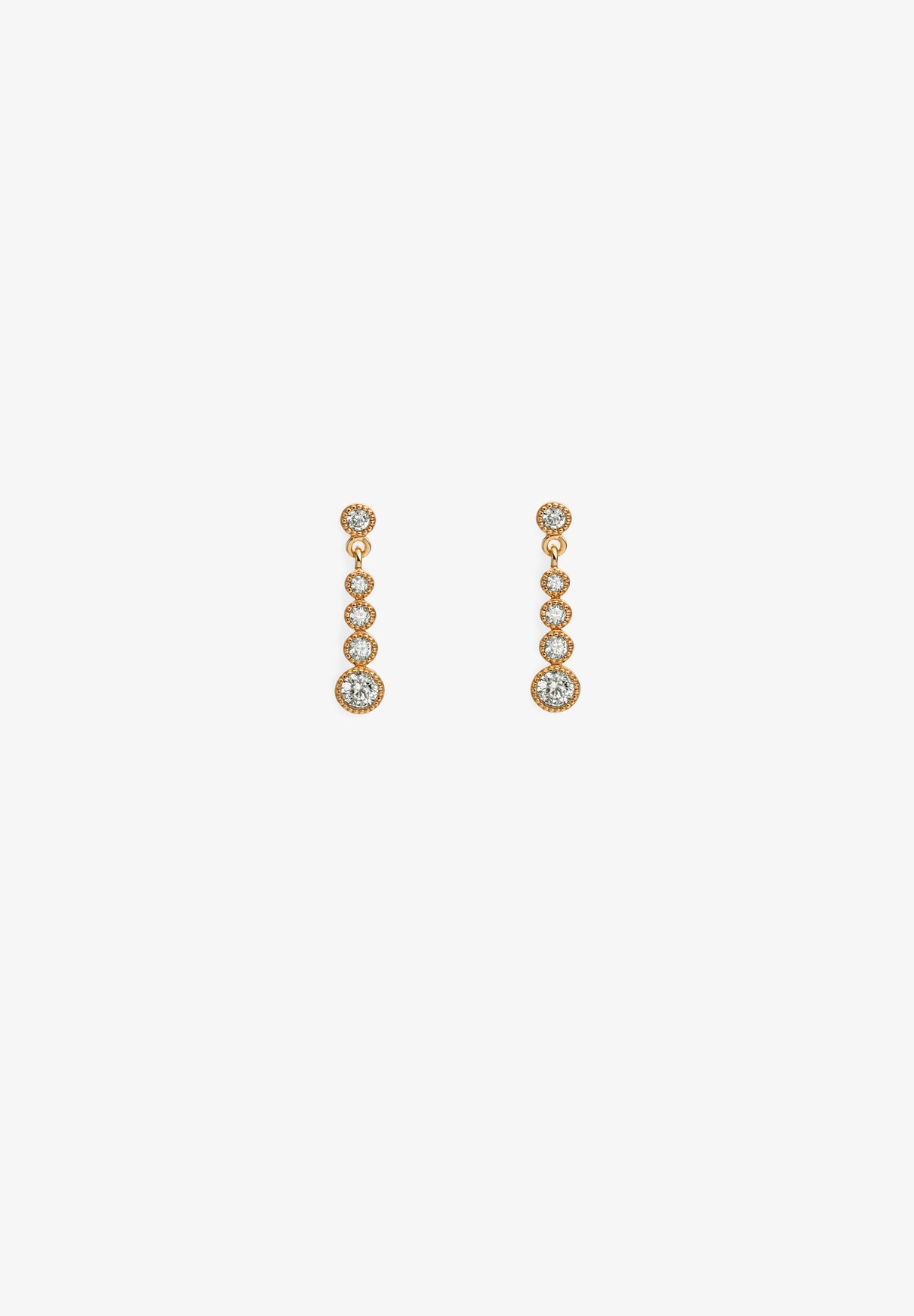 Pendientes Specciale confeccionados en cobre bañado en oro de 18 quilates. Presenta cinco circonitas de tamaño ascendiente.