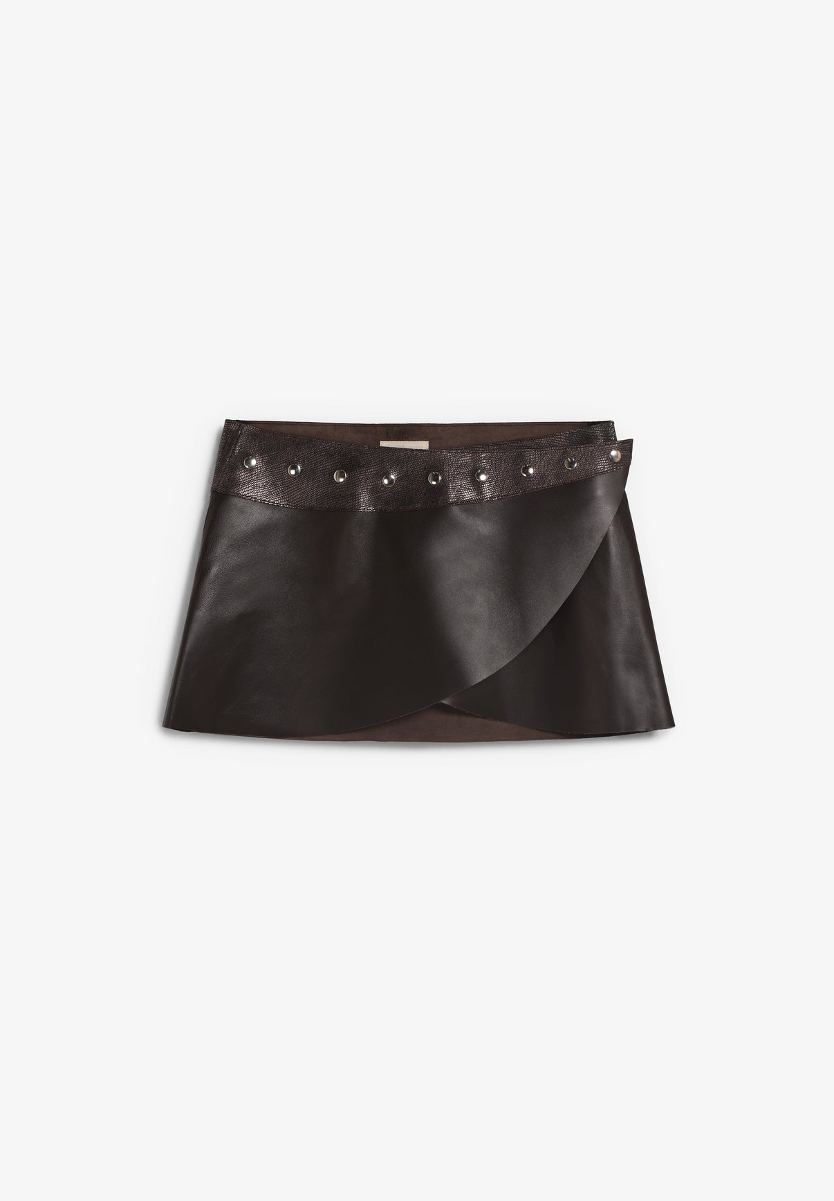 Falda Avelina confeccionada 100 % en piel de cordero español. Presenta cinturón ajustable con botones metálicos.