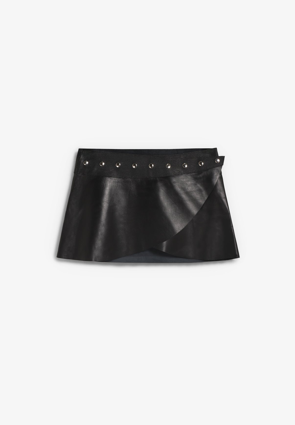 Falda Avelina confeccionada 100 % en piel de cordero español. Presenta cinturón ajustable con botones metálicos.