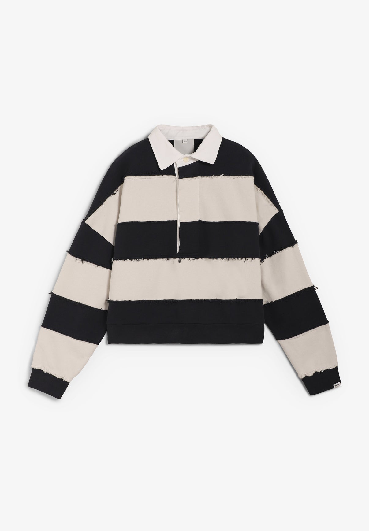 Sudadera tipo polo Bellerose confeccionada 100% en algodón. Presenta mangas largas con puños acanalados, cuello de popelín blanco con tapeta de botones oculta y detalles de costuras sin rematar en las transiciones entre rayas. Corte oversize