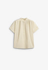 Camisa Bellerose confeccionada en 84% viscosa y 16% poliamida. Presenta diseño a rayas verticales, costuras fruncidas en los hombros y cuello semiabierto con detalles de botones.