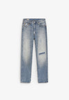 Pantalón denim confeccionado 100% en algodón. Presenta descosidos en la parte delantera, bragueta con cremallera y diseño de cinco bolsillos.