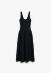 Vestido Sessun confeccionado 55% algodón y 45% viscosa. Presenta escote profundo redondeado en la parte delantera y trasera, detalle de frunces en la cintura y abertura en el lateral del bajo.