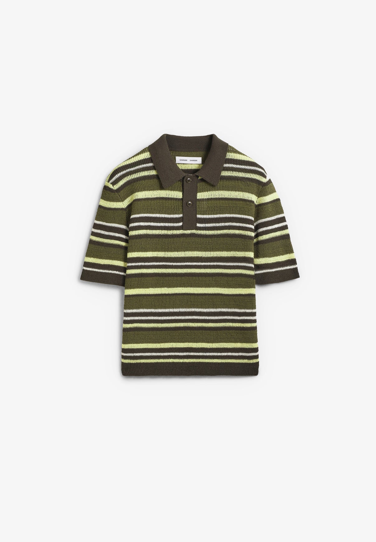 Polo de manga corta de punto Samsoe Samsoe confeccionado en 65% algodón orgánico y 35% poliéster reciclado. Presenta diseño a rayas horizontales, cuello tipo polo, cierre con botones en la parte delantera y puños de punto elástico.