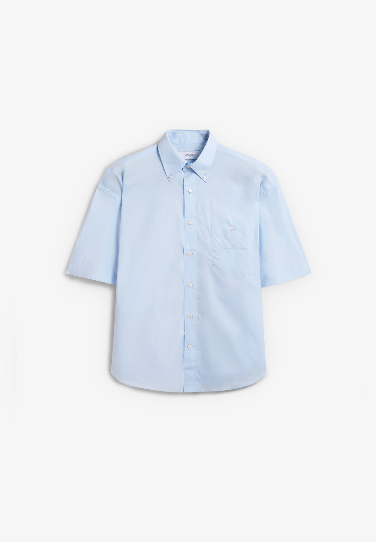Camisa de manga corta Unfeigned confeccionada 100% en algodón orgánico. Presenta diseño, bolsillo en el pecho y cierre frontal con botones de nácar. Corte oversize.