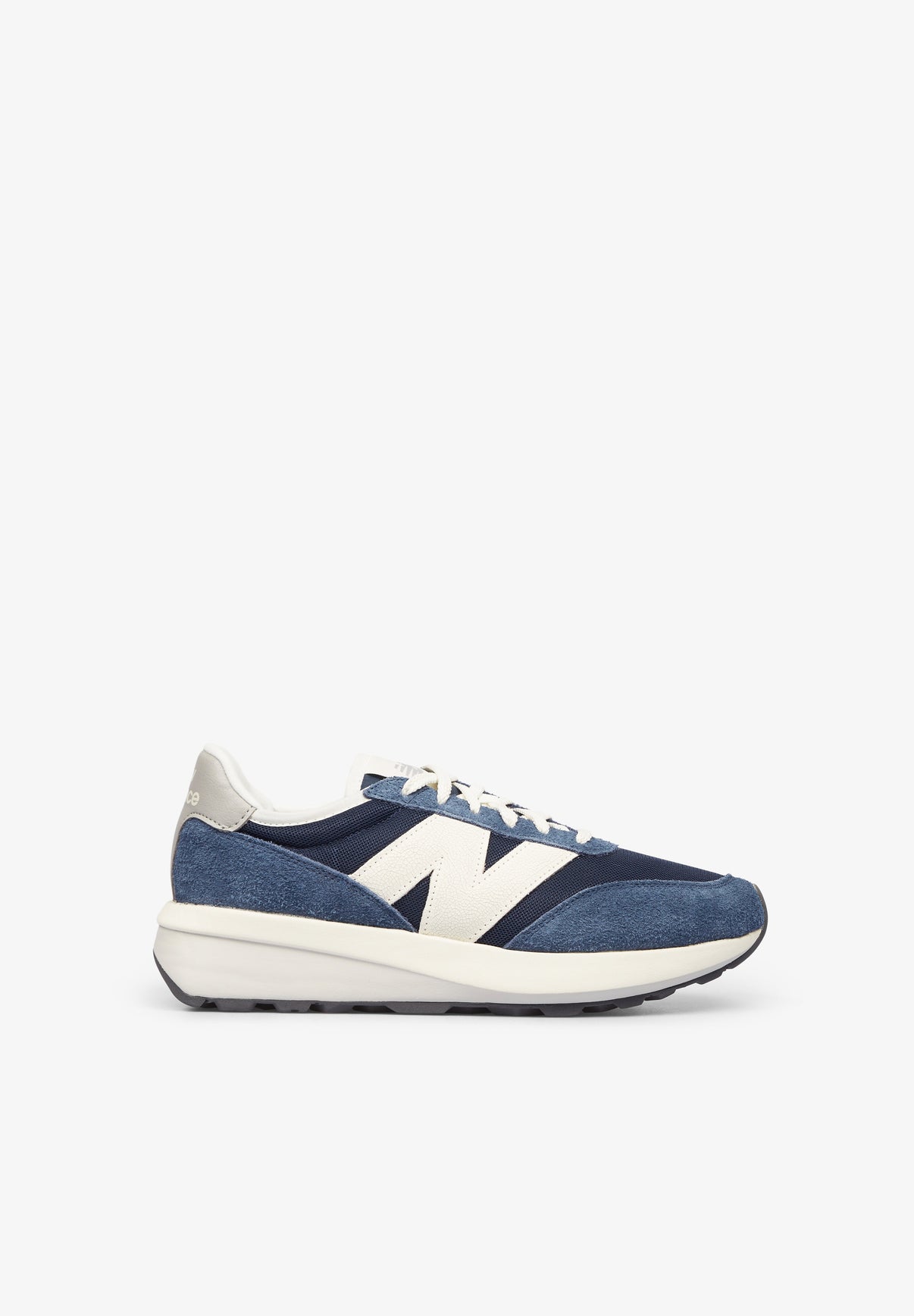 Ténis New Balance 370 confecionado em camurça e tecido, com bico redondo e fecho de cordões.