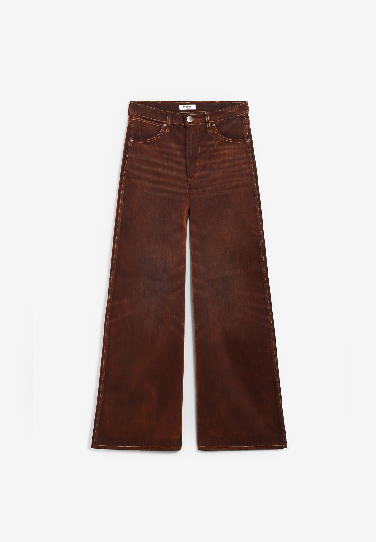 Calça de ganga Wrangler confecionada em 72% algodão, 23% poliéster, 4% viscose e 1% elastano. Apresenta modelagem flare, cintura subida e corte ajustado nas ancas. Inclui passadores de cinto, braguilha com fecho, fecho de botão e a icónica costura em "W", além de uma etiqueta em pele no bolso traseiro.