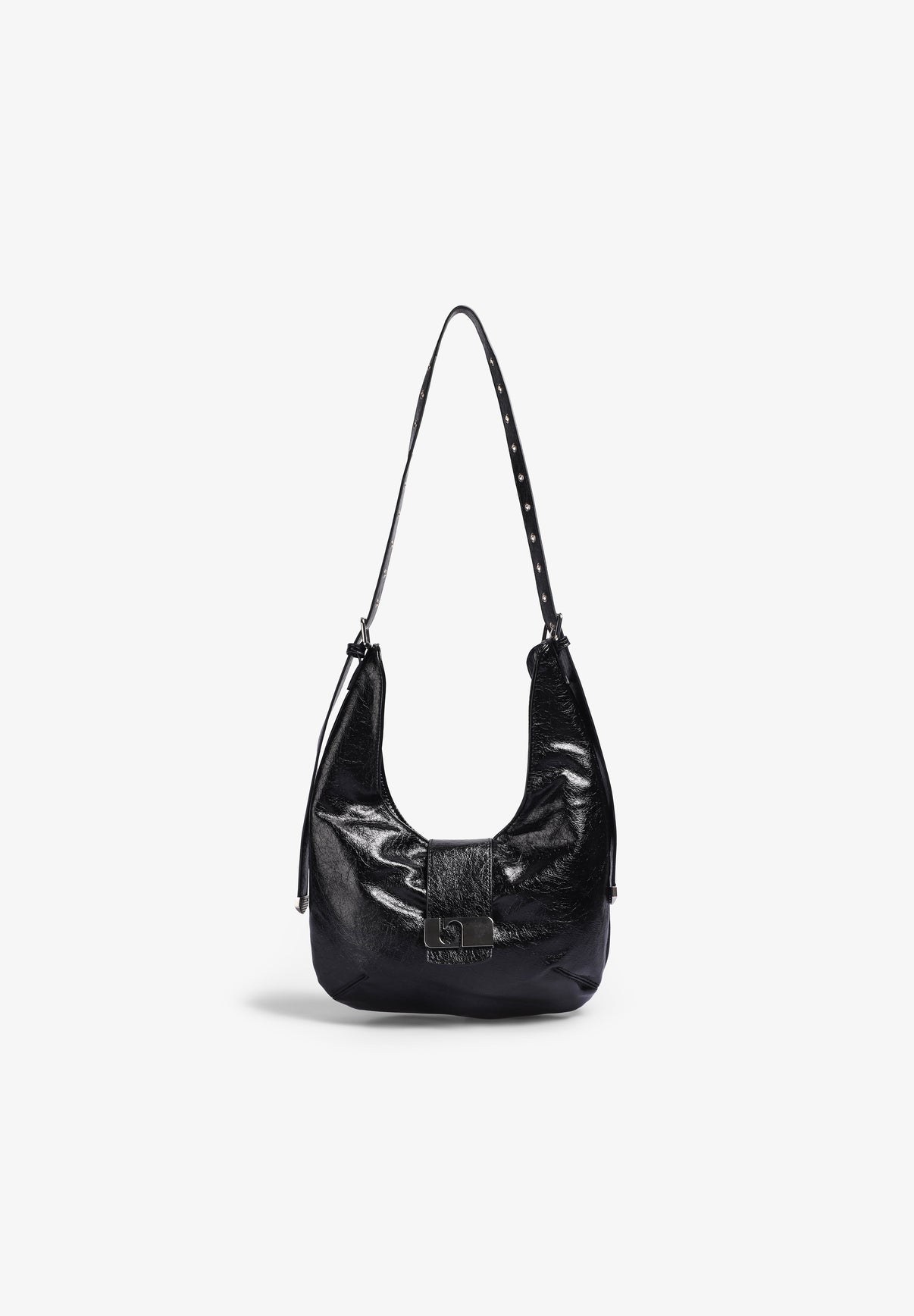 Mala Laagam confecionada em 100% algodão e pele sintética. Possui um detalhe metálico do logótipo na parte frontal, alça de ombro ajustável com ilhós em metal, fecho magnético e bolso interior com fecho.