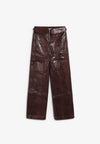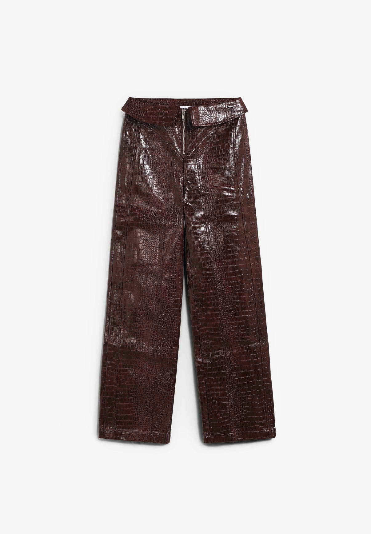 Calça Laagam confecionada em 100% poliuretano com cós interior em poliéster. Acabamento em pele sintética, cintura subida, detalhes de costura, cós duplo e fecho frontal em zíper metálico prateado. Costuras traseiras curvas com detalhes em fecho metálico. Corte reto.