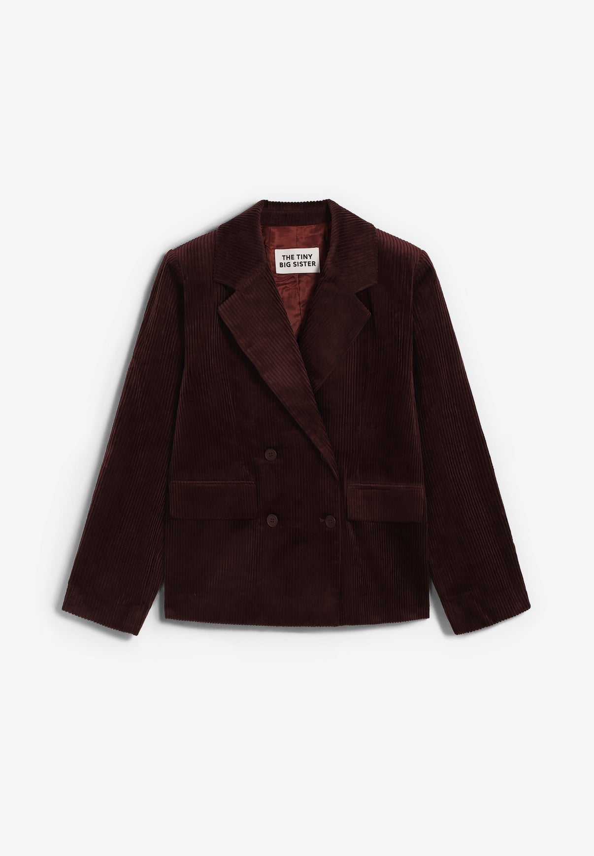 O blazer Tiny Big Sister é confecionado em bombazine grosso num tom bordeaux intenso. Possui lapela com entalhe, fecho duplo e bolsos embutidos. Uma abertura na parte de trás permite uma maior liberdade de movimentos, e o blazer é totalmente forrado.