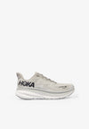 Ténis Hoka confecionado em tecido respirável com lingueta reforçada e atacadores em nylon e poliéster. Estabilidade neutra e amortecimento equilibrado.