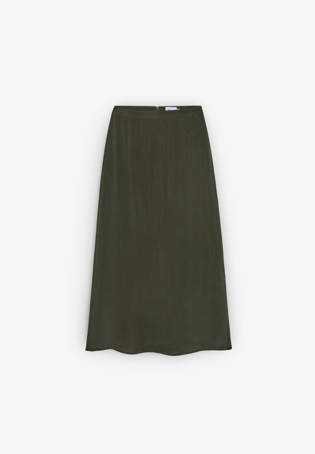 Saia Ramsos cupro verde azeitona. Saia comprida com racha nas costas e fecho de correr nas costas.