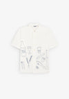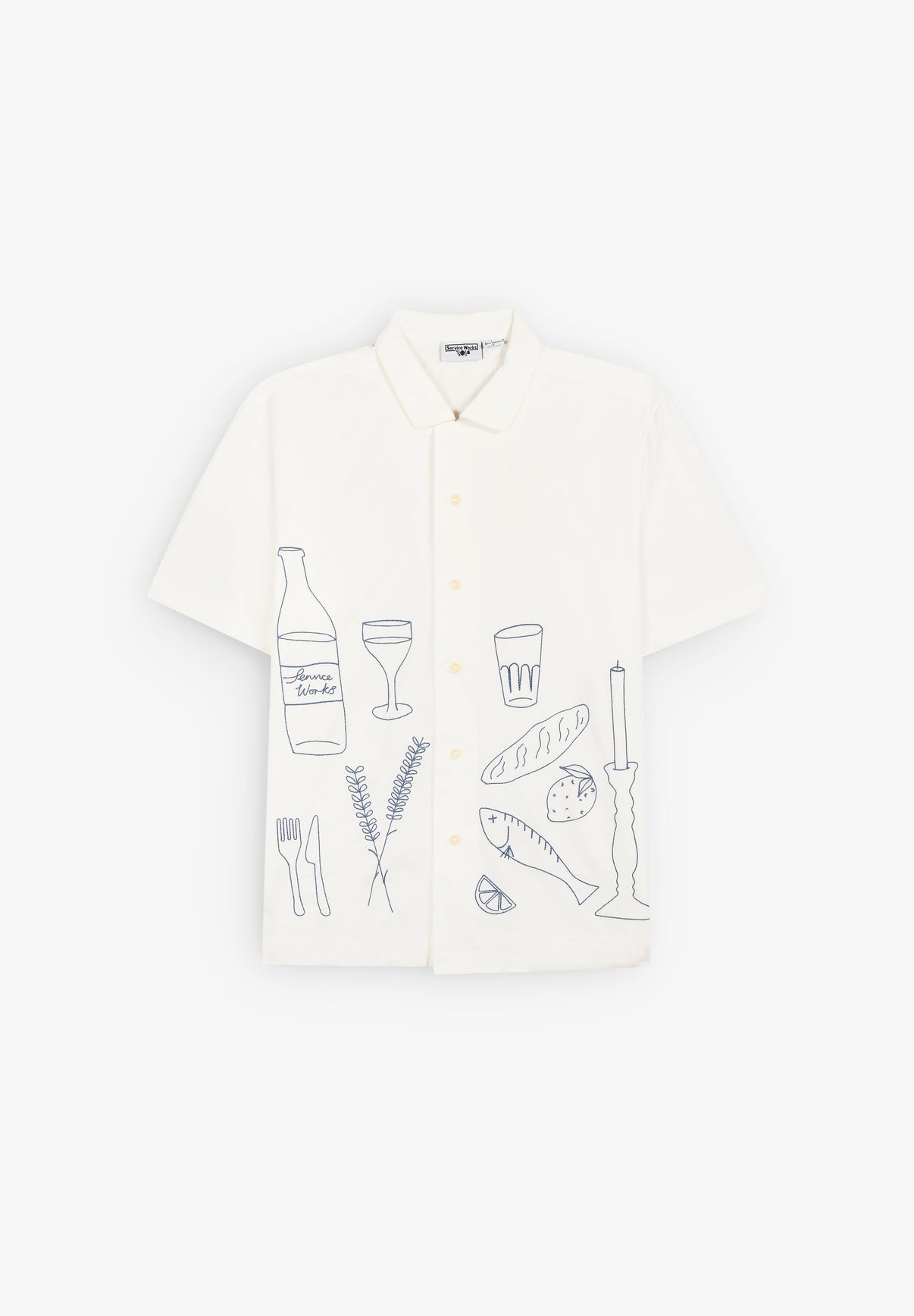 Camisa de manga corta con bolsillo frontal en el pecho, cuello estilo resort, cierre de 6 botones, presilla con botones en la parte superior, gráficos bordados
