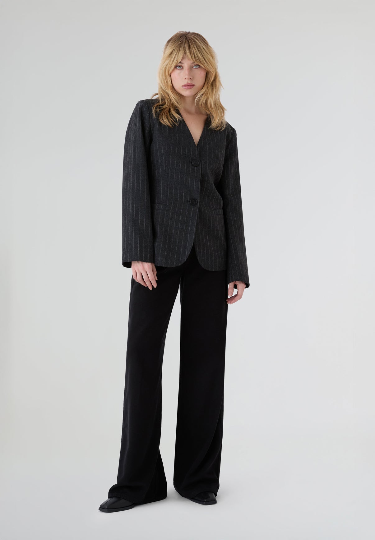 O blazer Grace & Mila é confecionado em 85% poliéster e 15% lã. Apresenta um design com riscas contrastantes, silhueta sem gola e modelagem ajustada. É forrado, tem fecho frontal com um botão e bolsos embutidos na parte da frente.