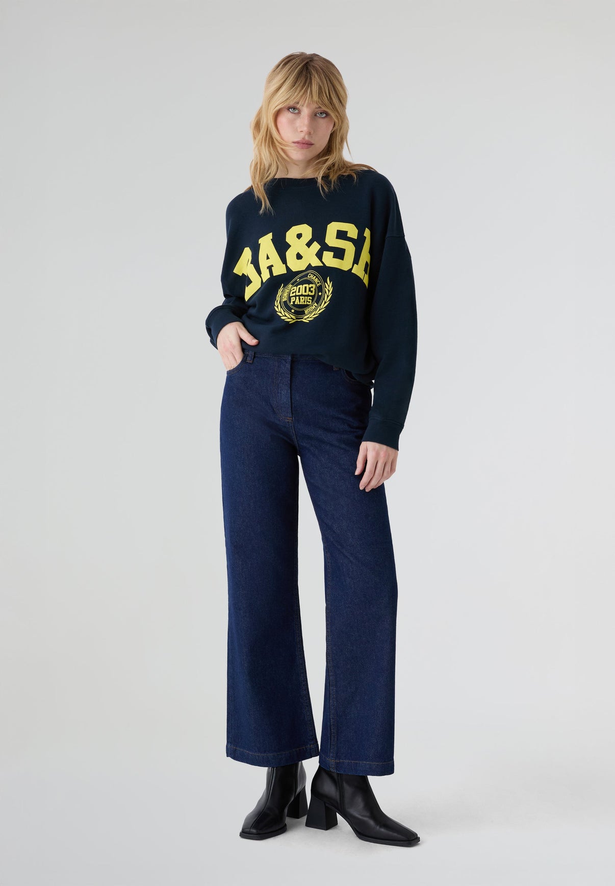 Pantalón vaquero Sessun confeccionado en 100% algodón, de corte recto y talle medio-ato. Cuenta con la pernera ligeramente acampanada, largo tobillero y puntadas a contraste. Cierre de botón en la cintura y cremallera oculta, bolsillos delanteros de relojero y bolsillos traseros de parche.
