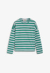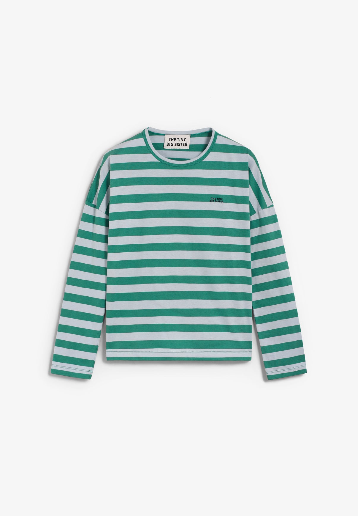 A t-shirt Tiny Big Sister é feita de 100% algodão orgânico. Apresenta um corte largo com riscas verde-escuro e azul-lavado, gola redonda e mangas compridas. Pormenor do logótipo bordado no peito.