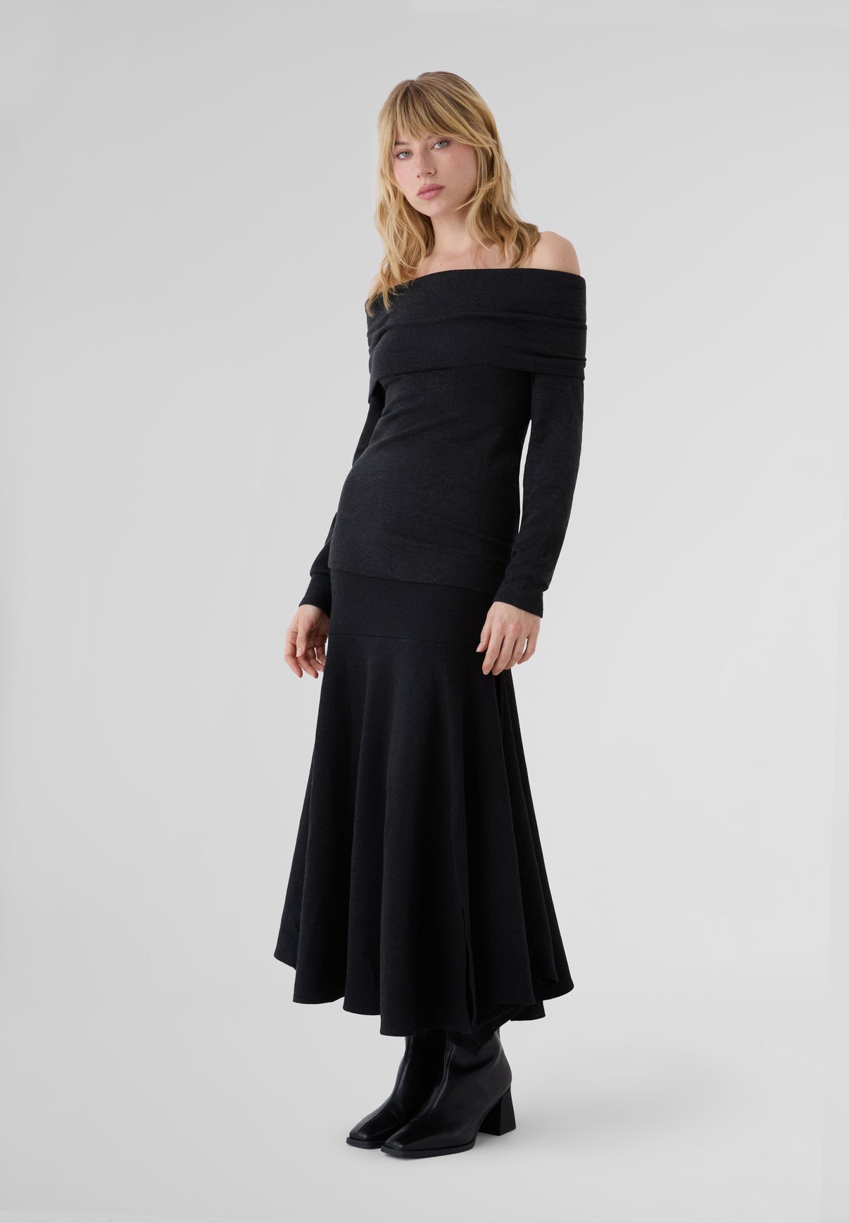 Saia preta e cinzenta confecionada em 64% viscose, 28% lã, 5% poliamida reciclada e 3% elastano. Possui cintura subida, comprimento até ao tornozelo e caimento fluido. Ajustada nas ancas e afunilada em direção à bainha, os painéis verticais realçam a sua estrutura e conferem movimento à peça.