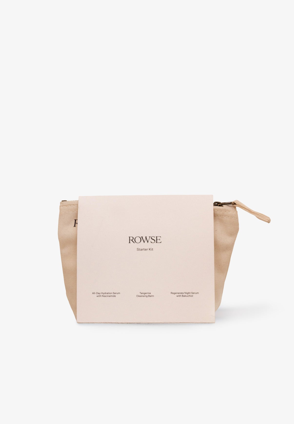 Nécessaire Rowse exclusiva contendo três produtos essenciais para uma rotina completa de dia e noite, 100% naturais, eficazes e livres de toxinas. O Bálsamo de Limpeza de Mandarina remove a maquilhagem, o excesso de oleosidade e as impurezas, prevenindo a secura. O Creme Hidratante de Dia com niacinamida proporciona e retém a hidratação, e o Sérum de Noite estimula a renovação celular e reduz os sinais de envelhecimento.