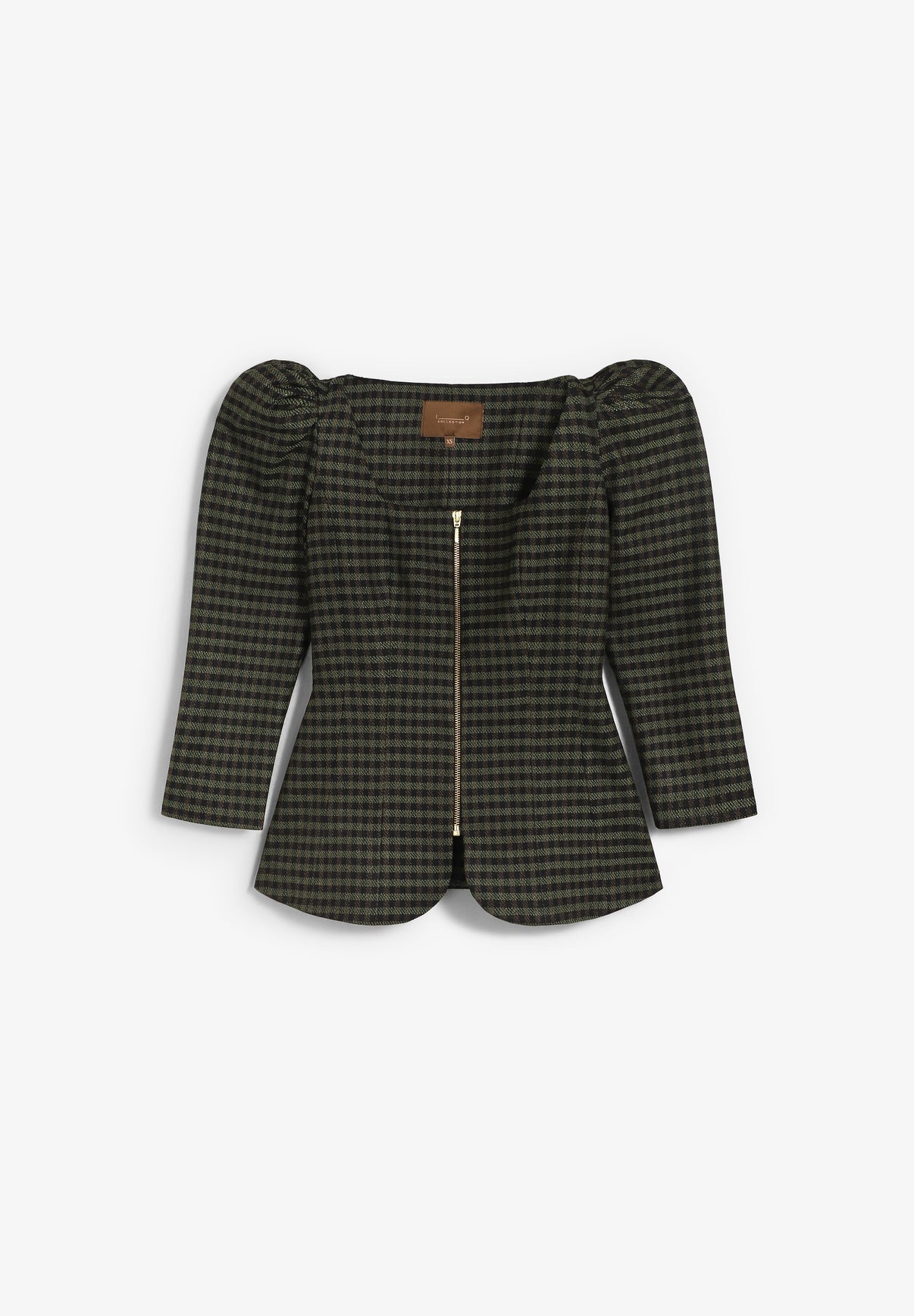 Top IQ Collection confecionado em 62% poliéster, 35% viscose e 3% elastano. Com um decote a direito, pormenor de ombreias e fecho de correr frontal dourado.