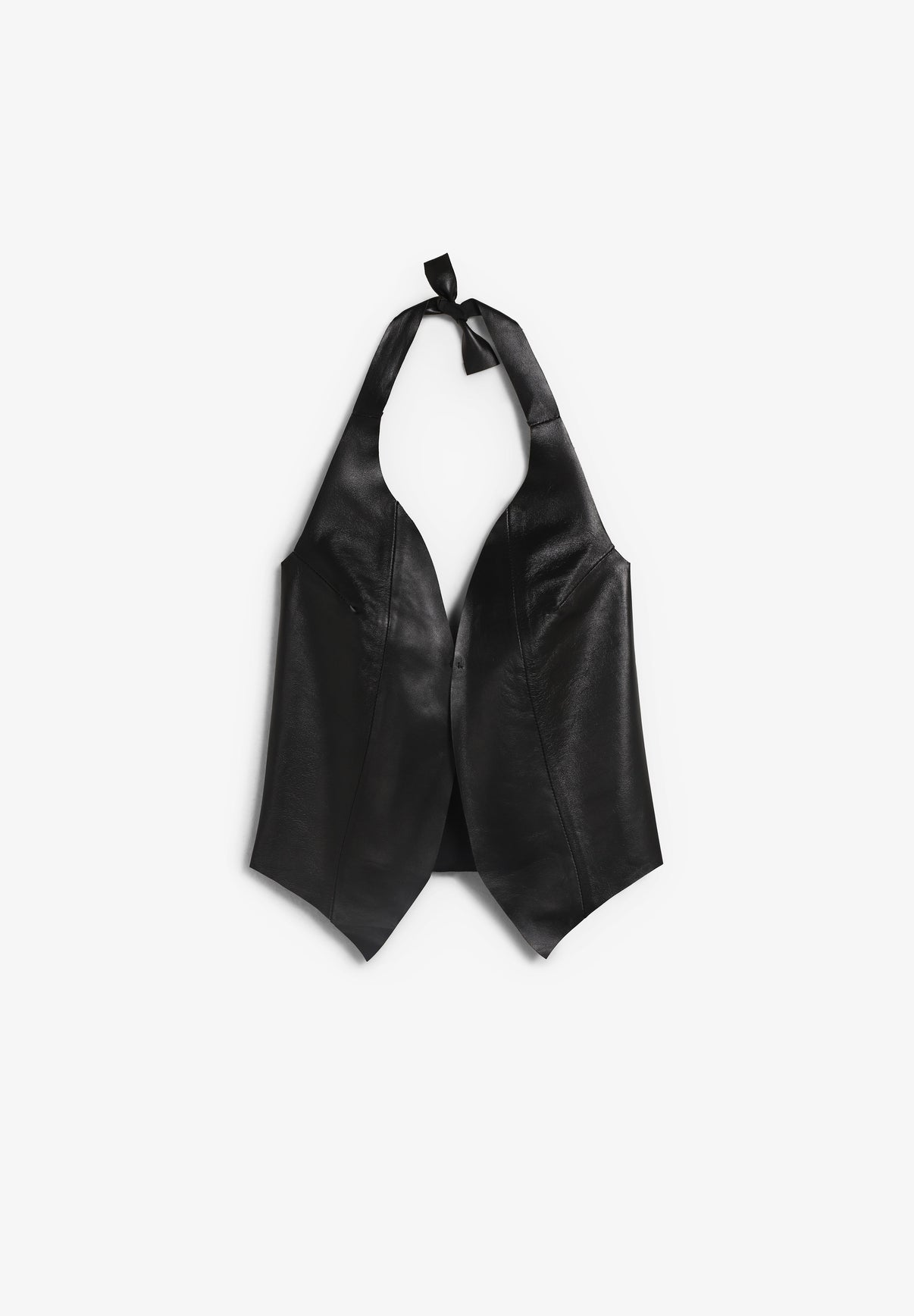 Top Avelina confeccionado 100% en piel de cordero español. Presenta lazos con los que lograr una buena sujeción.