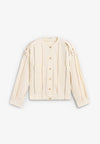 Cardigan Sessun confecionado em 70% algodão e 30% linho. Com galões nos ombros, bolsos de remendo à frente, cavas baixas com pormenor de pregas côncavas e fecho de botões.